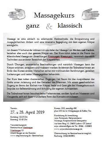 An diesem Wochenende widmen wir uns dabei der Massage von Rücken und Nacken, beziehen aber auch den ganzen Körper ein. Der Kurs führt dabei in die Praxis der Klassischen Massage ein (Streichungen, Kreisungen, Knetungen), vermittelt aber auch Techniken aus anderen Bereichen der Körperarbeit.